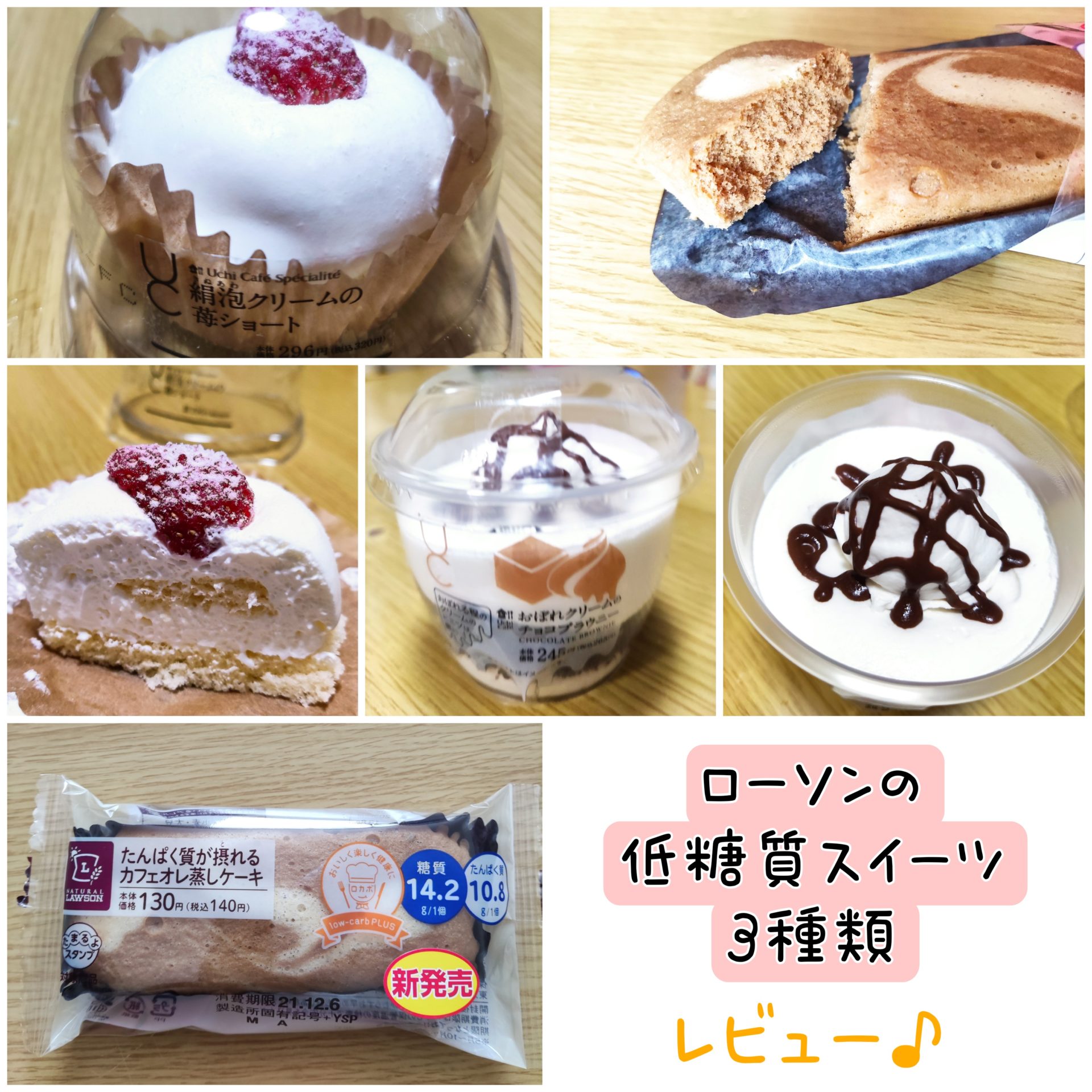 今回はローソンの低糖質スイーツ、「おぼれクリームのチョコブラウニー」と「たんぱく質が摂れるカフェオレ蒸しケーキ」、「絹泡クリームのイチゴショート」の3種類をレビューしました。